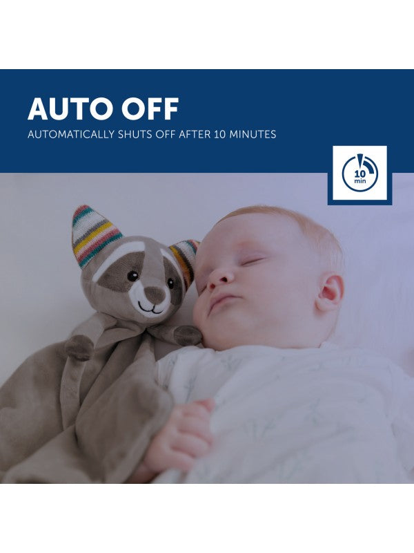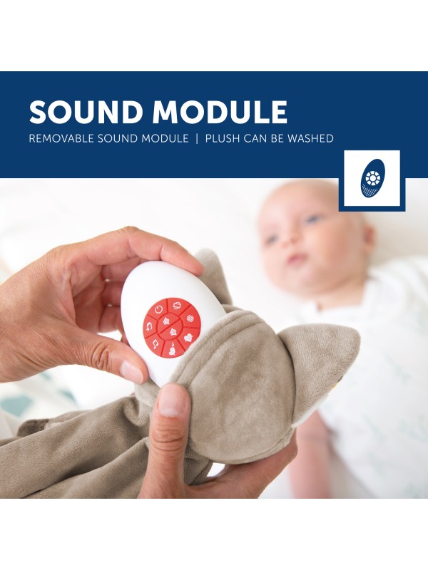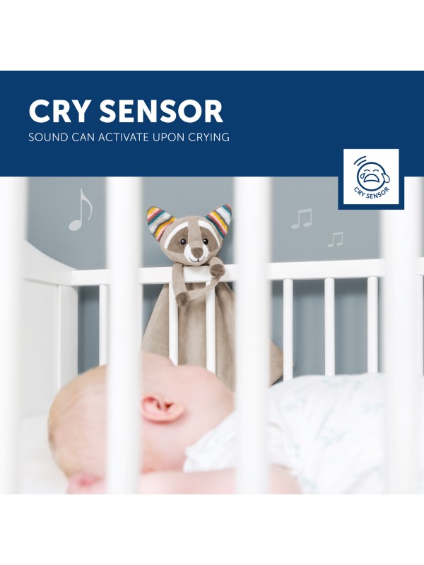 Robin speelt 6 verschillende geluiden af met de keuze uit een hartslag, natuurgeluid, white noise en 3 fijne slaapmelodietjes. Na 10 minuten schakelt de muziek automatisch uit. Als je kleine huilt, zorgt de huilsensor ervoor dat het laatst gekozen nummer weer wordt afgespeeld. Het knuffeldoekje komt met een module waarmee je de geluiden kunt kiezen en het geluidsvolume kunt regelen. De module kun je na het gekozen geluid in het hoofdje van het doekje plaatsen.
