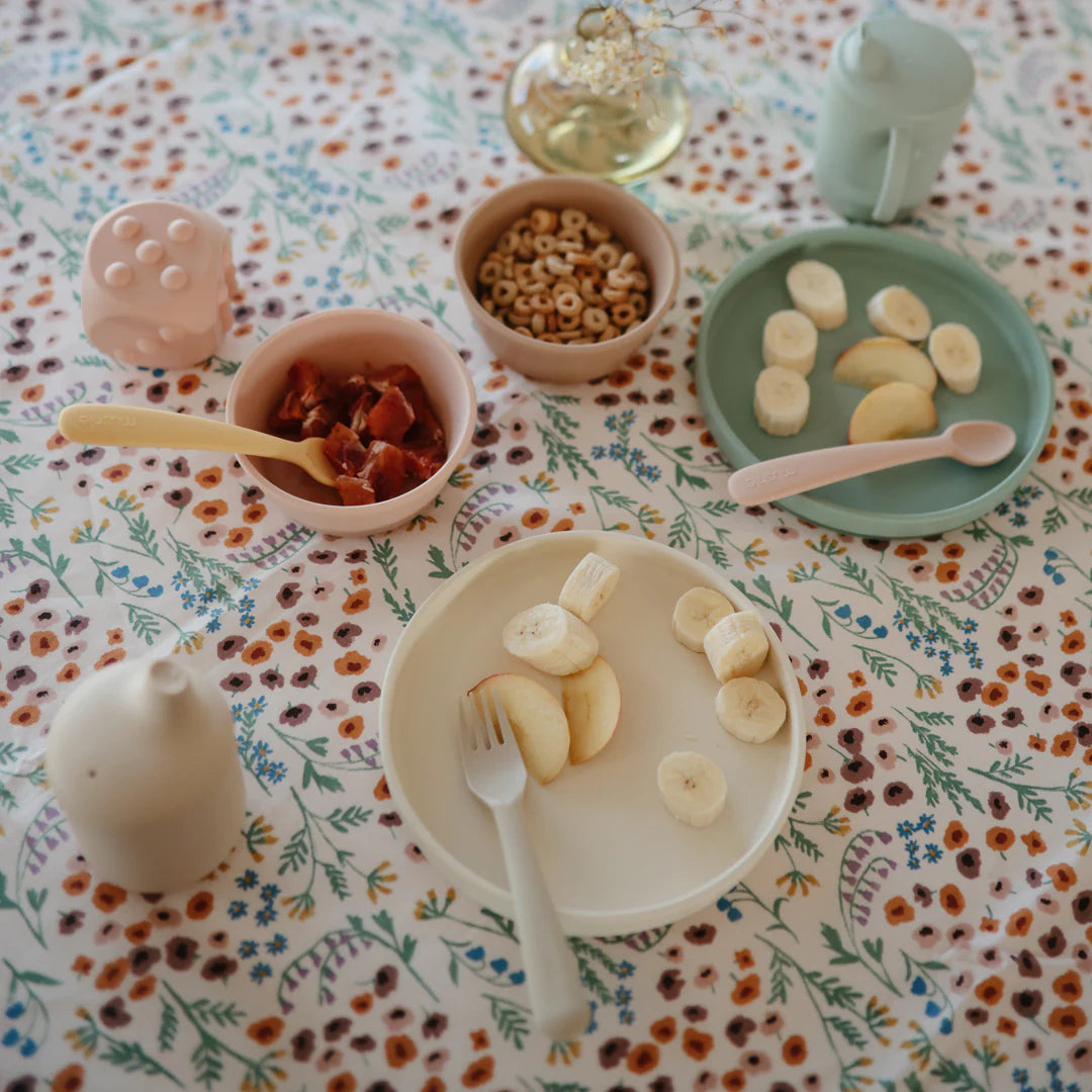 Un ensemble de deux cuillères en silicone pour bébé de Mushie pour les premières bouchées et les bouillies.