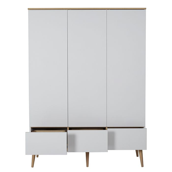 Suspendez les vêtements de votre enfant dans cette spacieuse armoire XL Flow Blanc et Chêne de Quax. Elle offre un grand espace de rangement et est fabriquée en bois MFC de haute qualité avec des pieds en hêtre.