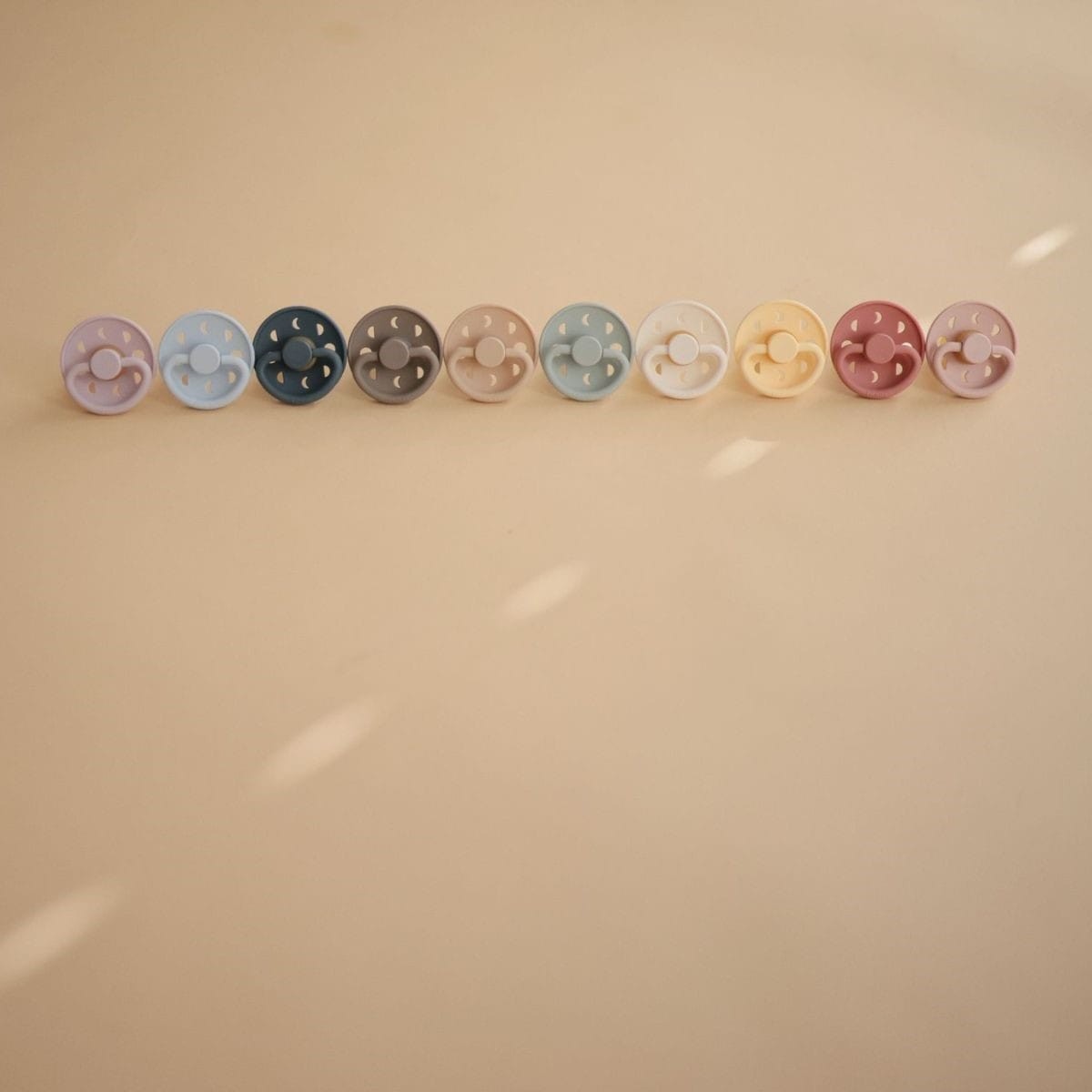FRIGG Moon Phase est une sucette inspirée par le mouvement de la lune. Les phases lunaires se reflètent sur le bord de la sucette, agissant comme des trous d'aération pour aérer la peau sensible de bébé.
