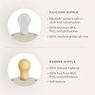 Materiaal speen: latex/natuurrubber - materiaal schildje: polypropylene (PP), 100% vrij van BPA, PVC en ftalaten