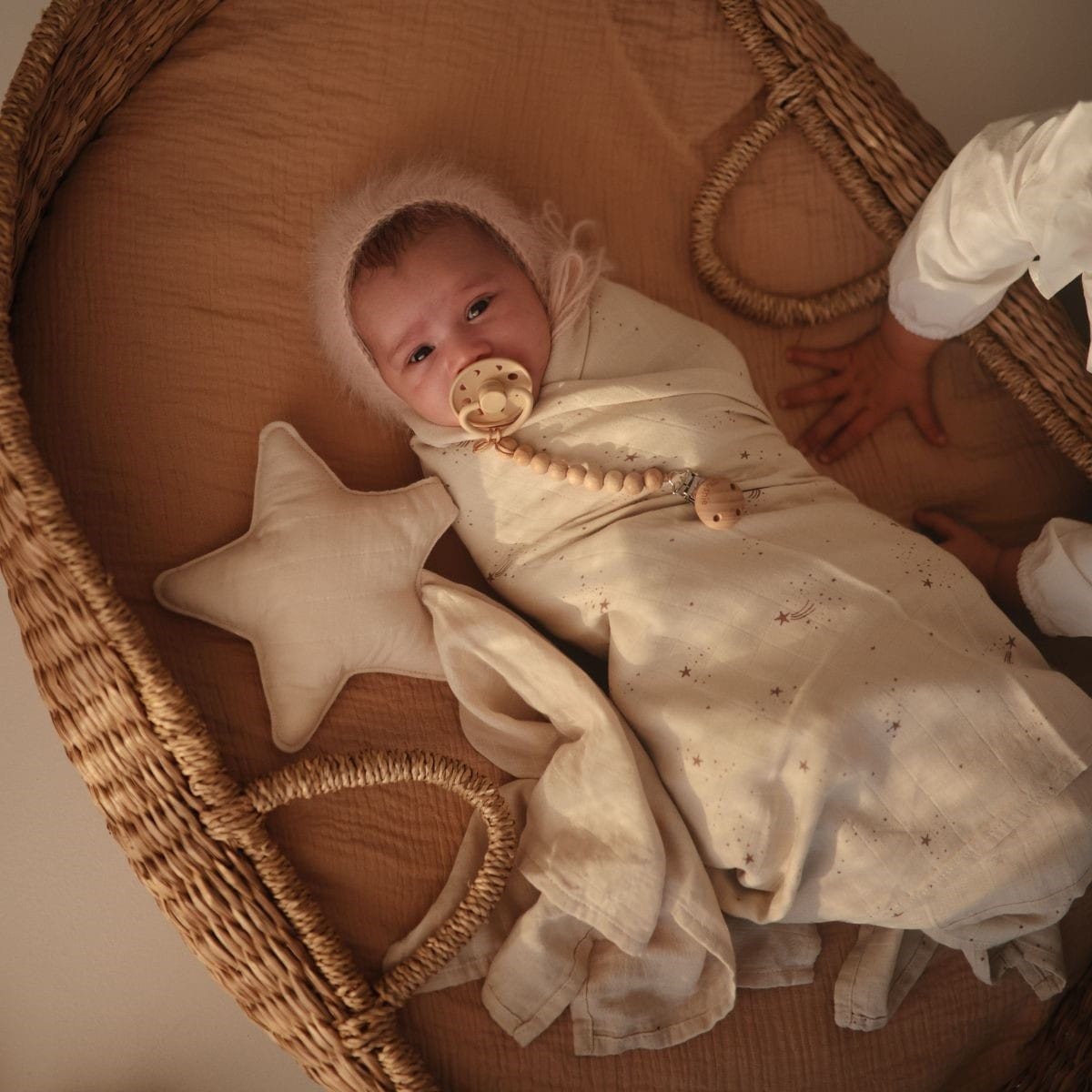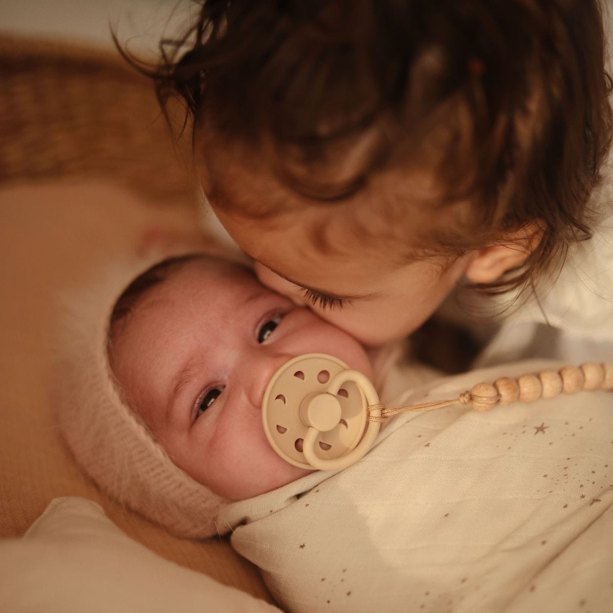 FRIGG Moon Phase is een fopspeen geïnspireerd op de bewegende maan. De verschuivende maanfasen worden weerspiegeld op het schild van de fopspeen en ze fungeren als luchtgaten om de gevoelige babyhuid te ventileren.
