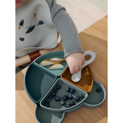 Maak een lekker bordje eten met dit charmante siliconen Liewood Arne verdeel bord. De verschillende vakjes geven de gelegenheid om een gevarieerde maaltijd te creëren. Met zijn afgeronde hoeken is het makkelijker om een hapje op te scheppen. Je kunt het bord ook gebruiken zonder vakjes, door ze er simpelweg af te halen. Hoe dan ook, je zult samen veel eetplezier beleven aan dit schattige diervormige bordje.