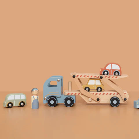 O, jee! Een auto met pech langs de weg. De houten truck rijdt met gemak de inbegrepen 4 voertuigen op en neer naar de garage. Help jij met inladen door de auto’s via de oplegger op de truck te rijden? Dan rijdt de truckbestuurder snel weer door. Een echte must have voor de kleinste autoliefhebbers!