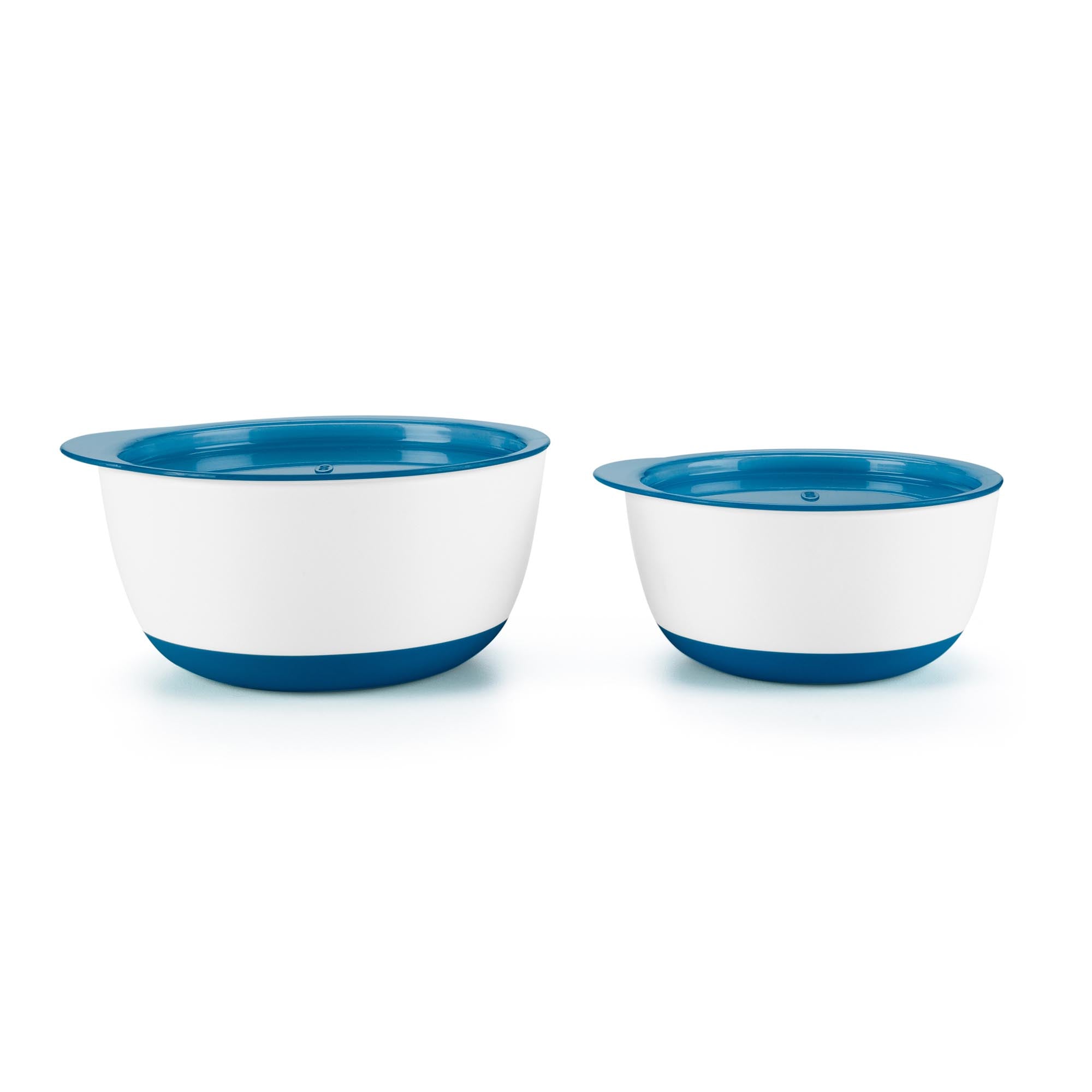 Met deksel zijn de kleine (200 ml) en grote kom (360 ml) stapelbaar, zonder deksel passen ze perfect in elkaar, voor een minimum aan opbergruimte.