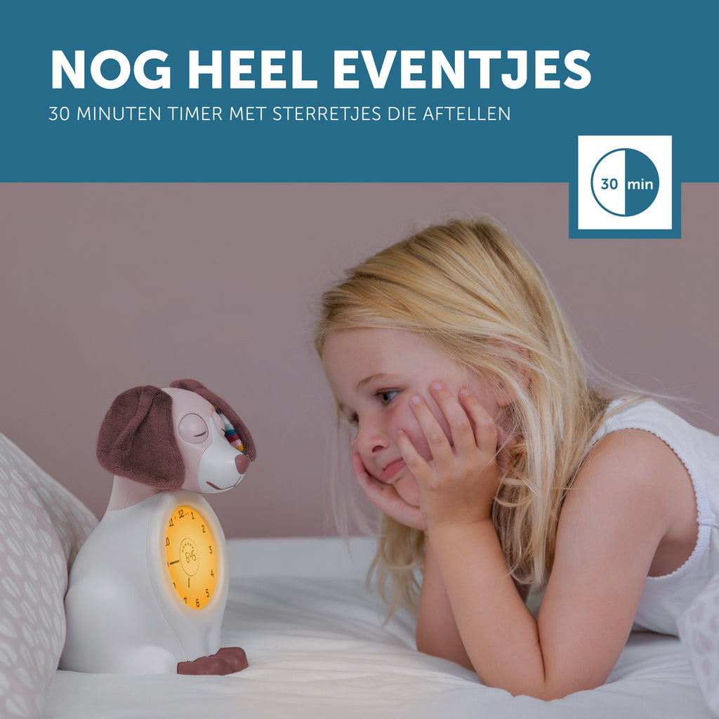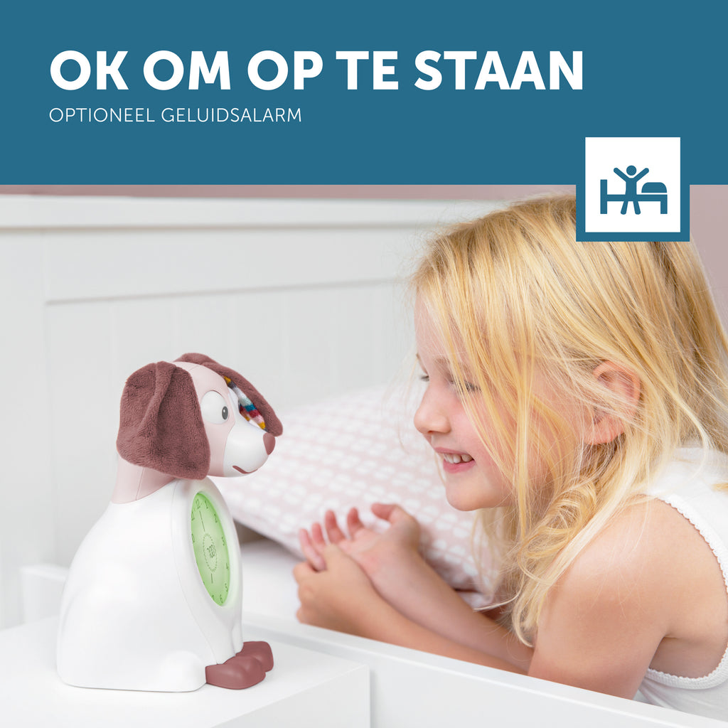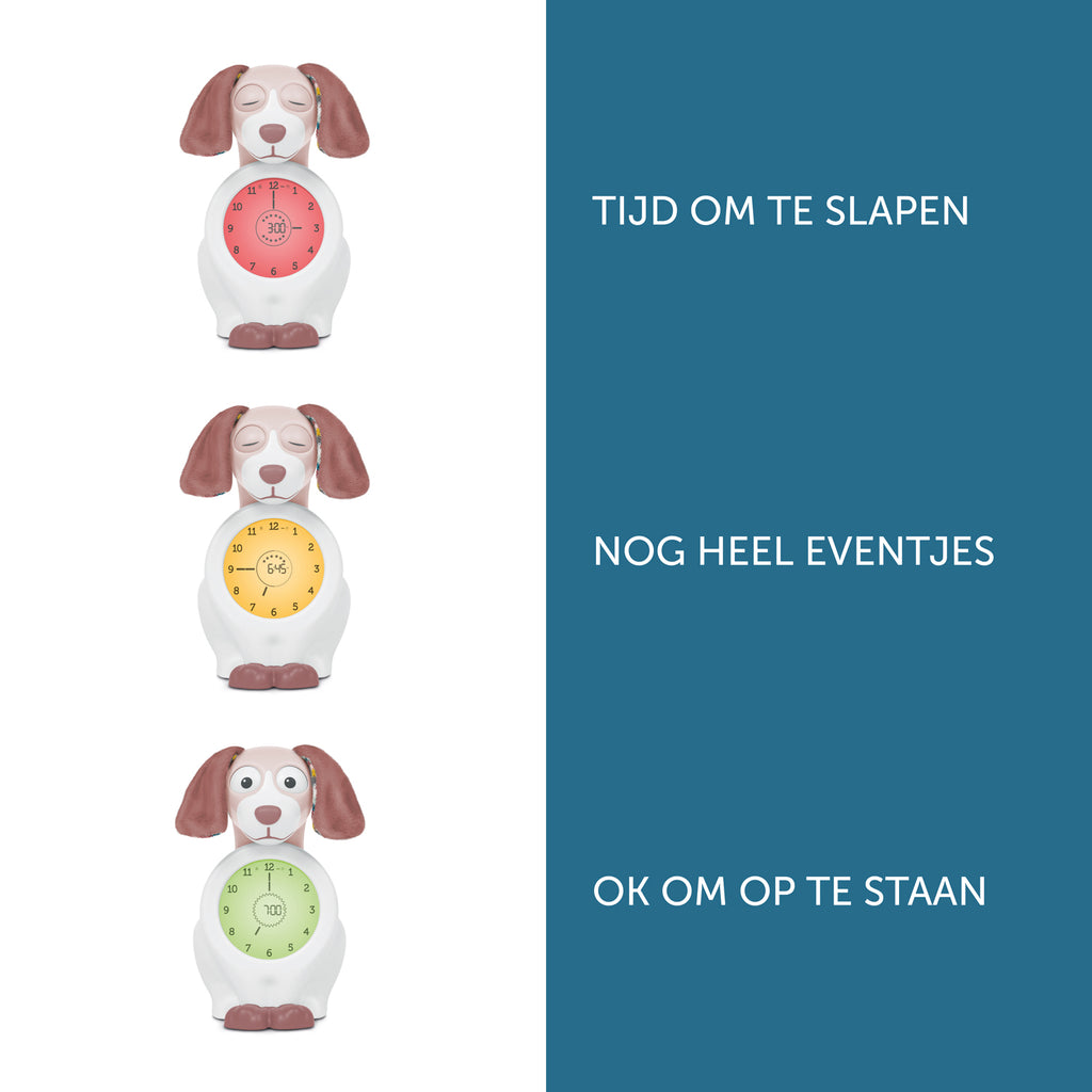Als je kindje de volgende dag wakker wordt terwijl het nog geen tijd is om op te staan, laat Davy de hond zien hoe lang het nog duurt tot hij wakker wordt. Als het nog maar een half uurtje duurt voor het tijd is om wakker te worden, zal het scherm van Sam oranje oplichten. Je kind hoeft dan nog maar heel even geduld te hebben! De sterretjes op het scherm tellen af wanneer het half uur voorbij is.